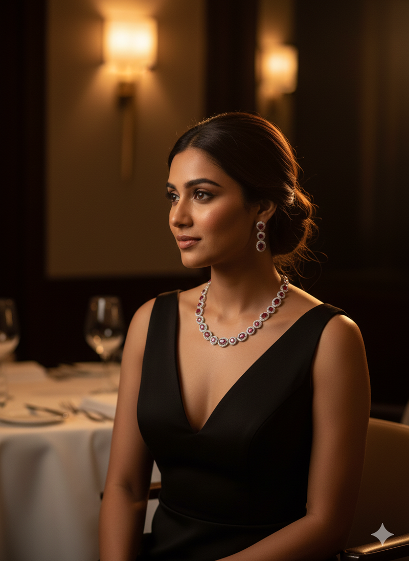 • Product Id : 4677940 • Package Details : 1 Necklace/1 Pair Of Earring • Type : Necklace Designs • Look : Designer • Jewellery Work : American Diamonds • Color : Red • Plating : Rhodium • Base Material : Brass • Care : Keep Away From Perfume & Water Payments [+]