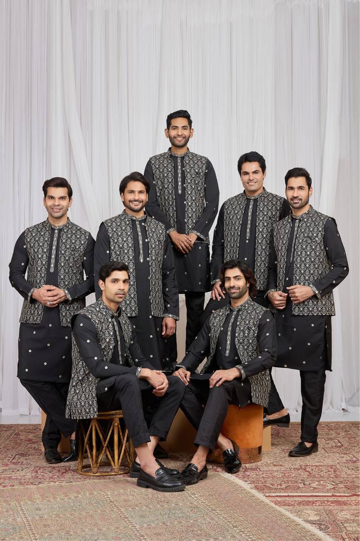 Black Art Silk 3 Peice Kurta Jacket Set For Men