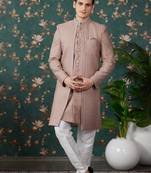 Light Brown Computer Thread Work On Art Silk 3 Piece Indo Western With Faux Satin For Mens