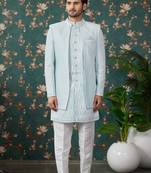 Light Blue Computer Thread Work On Art Silk 3 Piece Indo Western With Faux Satin For Mens