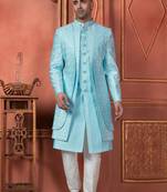 Men Sky Blue Computer Thread Work On Art Silk 4 Piece Attached Jacket Set