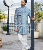 Men Teal Blue Computer Thread Work On Velvet Indo Western