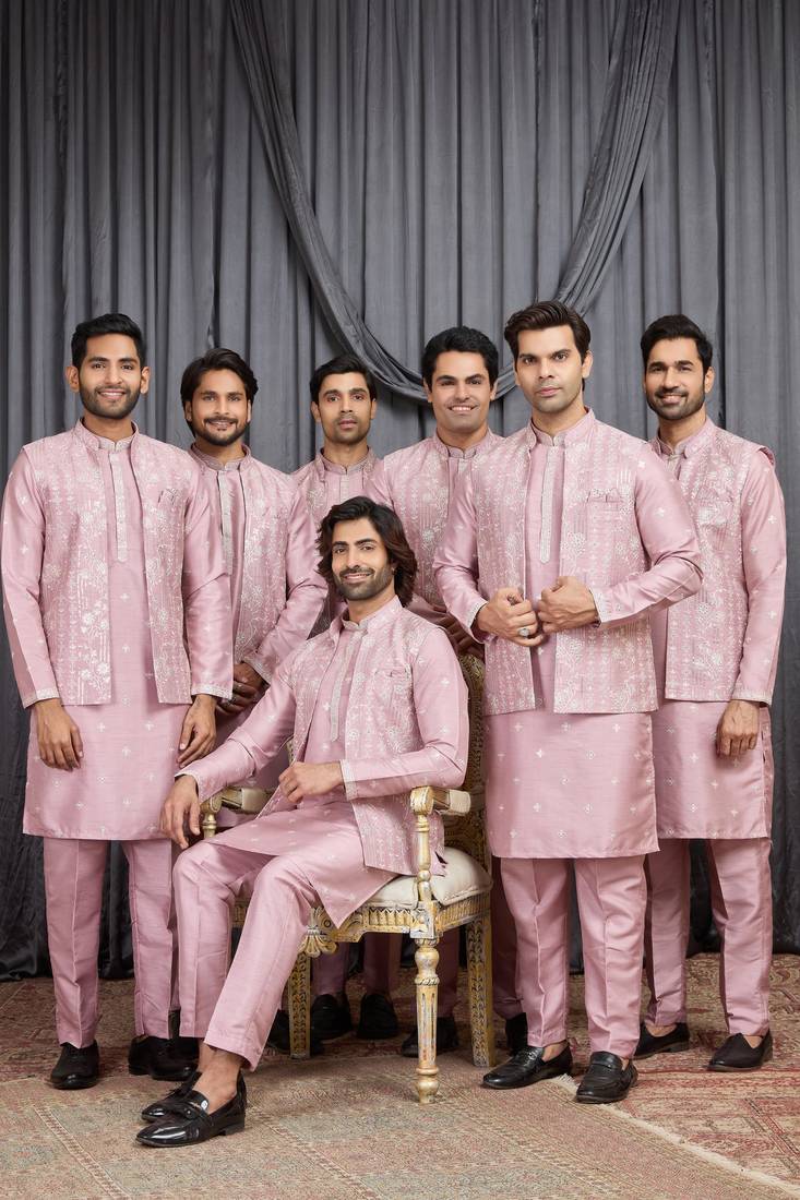 Pink Art Silk 3 Peice Kurta Jacket Set For Men