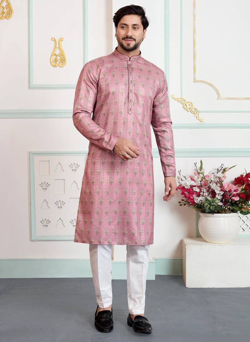 Pink Art Silk Straight Kurta For Men