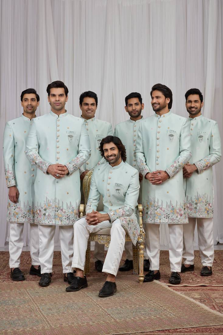 The ultimate Groom Sherwani. A piece of luxurious men's ethnic wear, perfect for your wedding or festive event. Features premium fabric and designer embroidery for an unforgettable traditional look.