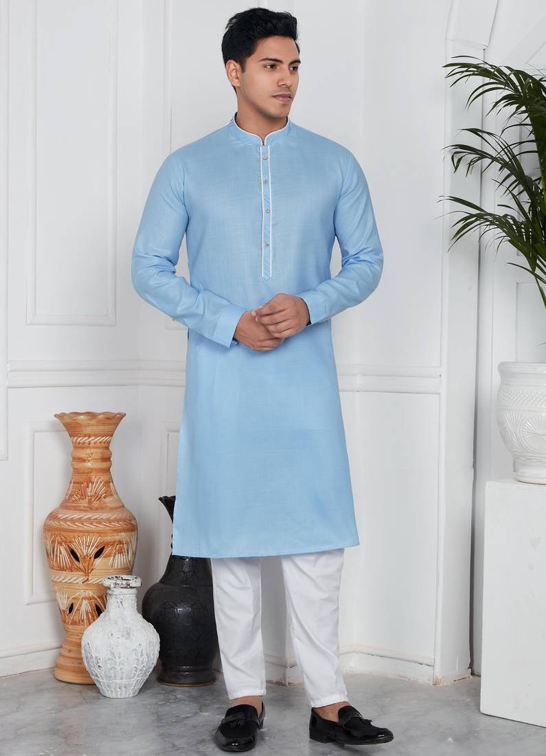 Sky Blue Linen Cotton Kurta For Men