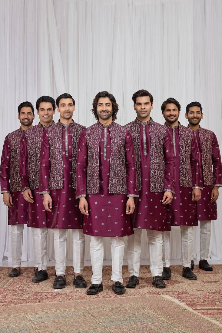 Wine Art Silk 3 Peice Kurta Jacket Set For Men