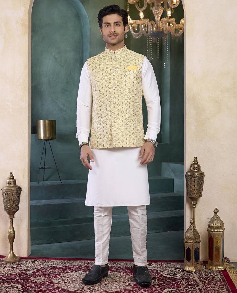 Yellow Jacqaurd 3 Piece Kurta Jacket Set For Men