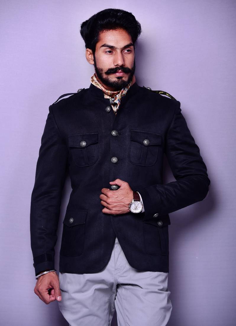 An Achkan exhibits a ceremonial and regal aura. It is teamed up with various accessories to complement the attire. It is teamed up with Kantha (necklace), Safa with Sarpech (Brouche), Crossbelt, Pocket Square and Mojari (Juttis/Shoes) to flaunt the complete Maharaja look. We offer all the mentioned/depicted accessories except swords in customizable combination offers ( Kindly contact us in case you want to customize your order and add accessories.)