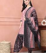 Beautiful Suit look pretty like never before.Wearing this Mauve Color Suit which made from Rajnandini with Mauve & Black Colored Geometric Printed Cotton Blend Bottom and Mauve & Black Colored Cotton Blend Dupatta.Suit has also decorative work like Floral Print with Fancy Buttons.This beautiful suit features a classy Printed Work all over,which makes it a smart pick for all occasions. You can wear this Suit in different styles. You can wear it occasionally or casually.
