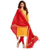 Beautiful Suit look pretty like never before.Wearing this Yellow Color Suit which made from Banarasi with Red Colored Cotton Churidar Bottom and Red Colored Banarasi Jacquard Dupatta.Suit has also decorative work like Weaving Work.This beautiful suit features a classy Banarasi Work all over,which makes it a smart pick for all occasions. You can wear this Suit in different styles. You can wear it occasionally or casually.