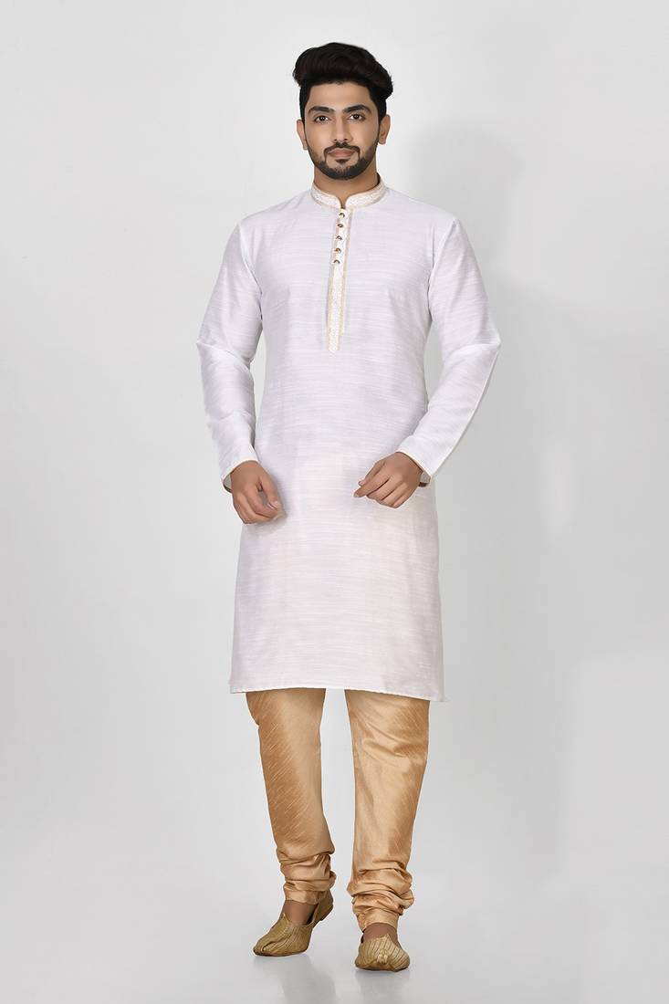 • Product Id : 4279268 • Package Details : 1 Kurta / 1 Pajama • Type : Kurta Pajama • Work : Embroidered • Sleeve : Full Sleeve • Top Color : White • Top Fabric : Silk • Bottom Style : Pyjama • Stitching : Stitched Payments [+]