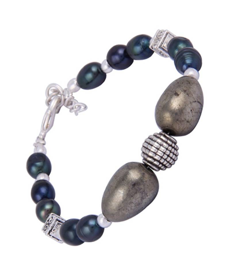 this chic bracelet is designed by Pearlz Gallery and is prepared using golden pyrite beads and dyed black freshwater pearls. this bracelet is embellished with alloy beads to beautify it. the bracelet measures 7.5 inches in length and is secured with silver tone metal lobster claw clasp.