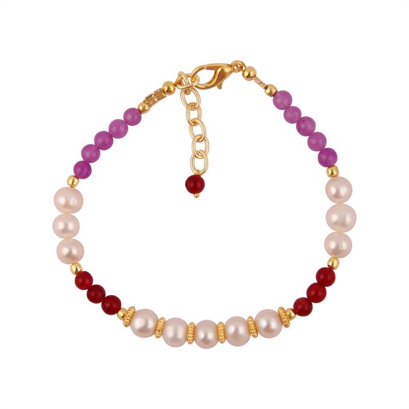 A golden tone base metal lobster claw clasp safely holds the Pearlz Ocean Bracelet to grace your wrists with elegance. This pearl bracelet includes beautiful white freshwater pearls, red jade and purple jade gemstone beads that you can use to get noticed in any gathering. The length of the bracelet is 7 inches and it has an extension of 1 inch. The high polish on this dazzling bracelet will have people asking you where you got it all day long. Product color may slightly vary due to photographic lighting sources or your monitor settings.