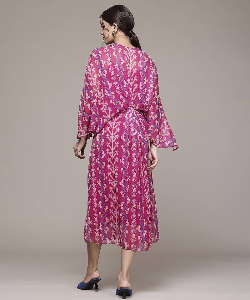 If you find the product for less we'll match it! Know Morethis fuchsia chiffon kaftan features printed work across a lightweight and flowy fabric. the chiffon material ensures a soft drape and comfortable wear suitable for festive occasions and resort styling. full sleeves provide a balanced and relaxed silhouette. the printed design adds visual detail while maintaining a clean and structured appearance. the stitched construction ensures a ready to wear form. the bold fuchsia shade supports versatile styling with ethnic and contemporary accessories.