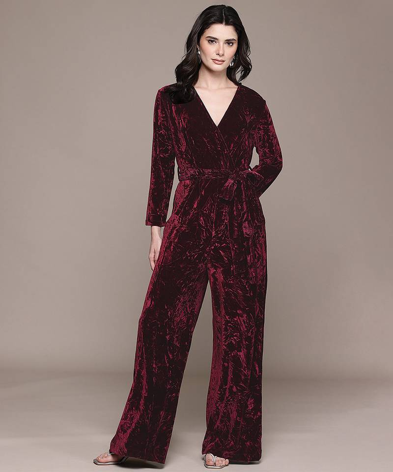 If you find the product for less we'll match it! Know MoreThis Maroon Velvet Jumpsuit Exudes Luxury With Its Rich Texture And Bold Color. The Soft Fabric Enhances Its Elegant Appeal, While The Tailored Silhouette Ensures A Flattering Fit. Perfect For Parties And Special Occasions, It Delivers A Statement Look With Effortless Sophistication.