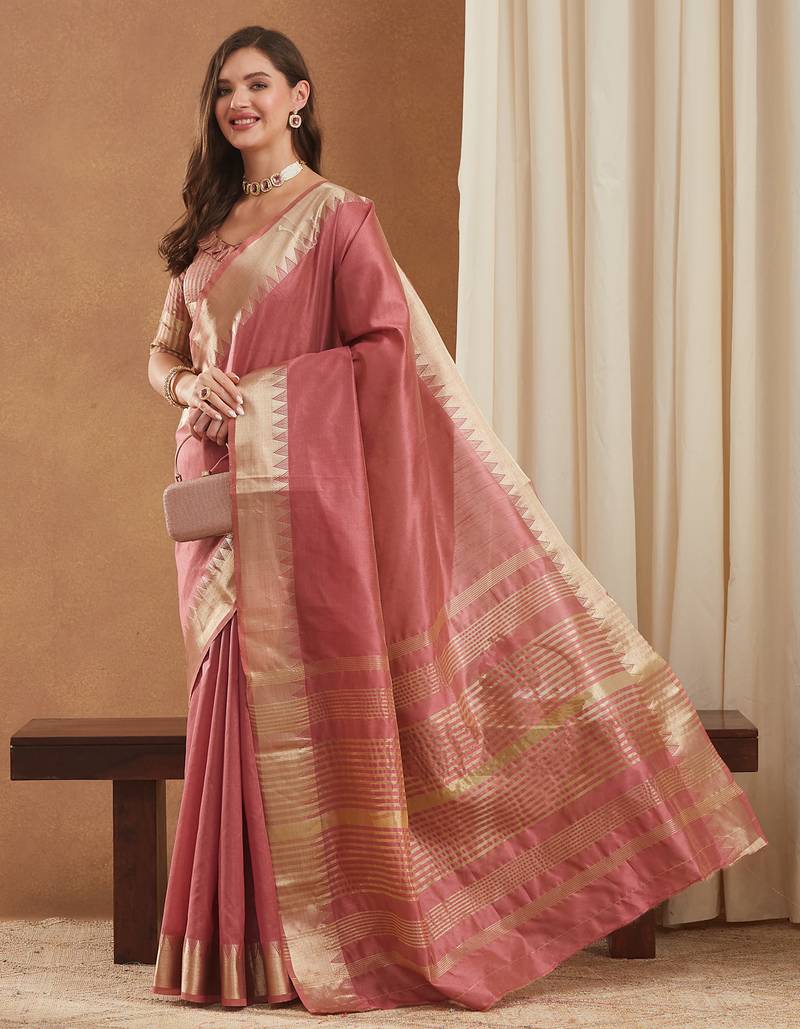 Assam Art Silk Saree With Zari Temple Border & Unstitched Blouse