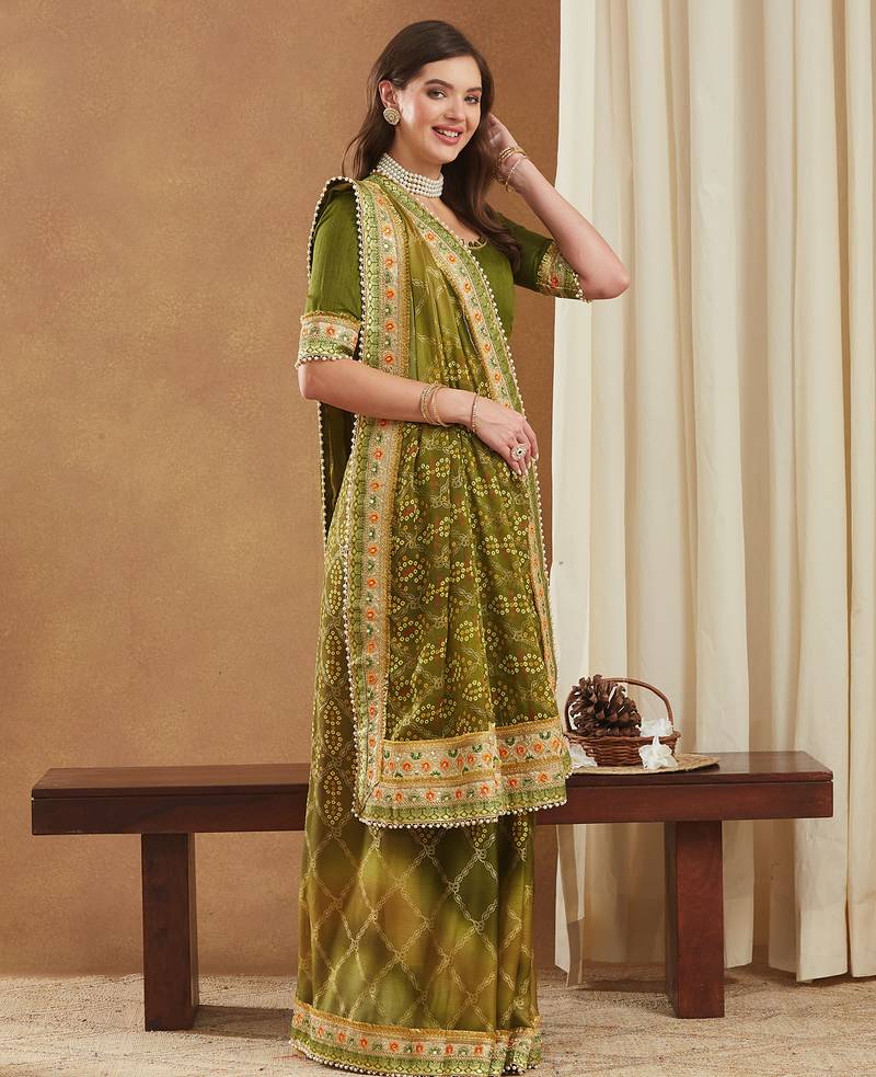 Experience a stunning blend of traditional elegance and contemporary appeal with this Bandhej-printed Mose Chiffon saree. Designed in a striking half-and-half style, one portion features vibrant prints while the other showcases classic bandhani artistry. The saree is enriched with a multilayered lace border and golden gotta patti lace, giving it a festive, luxurious finish. Paired with an unstitched Banglori Silk blouse measuring 0.8 meters, this exclusive wear saree promises both sophistication and comfort. The fabric drapes beautifully, making your every move graceful and stylish.