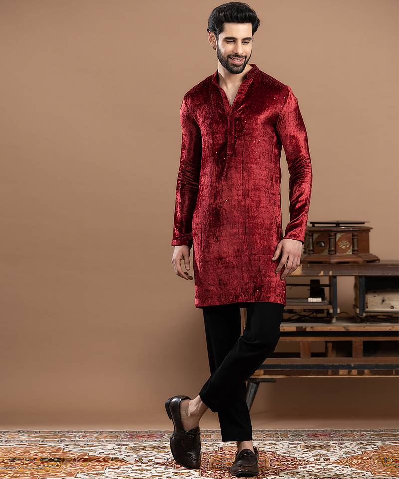 Maroon Embroidered Velvet Kurta Pajama Crafted For A Rich, Royal Look. Made From Luxurious Velvet, It Features Intricate Embroidery That Adds Depth And Elegance. Ideal For Weddings, Festive Occasions, And Evening Celebrations, This Ensemble Blends Comfort With Timeless Tradition And Refined Ethnic Sophistication.