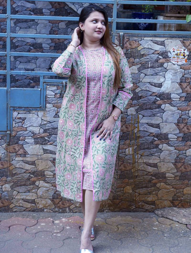 Embrace effortless elegance with this beautifully handcrafted floral kurta in soothing pink dabu print tones. Adorned with delicate pink floral motifs and intricate vertical panel detailing, this piece reflects the timeless beauty of traditional handblock printing.