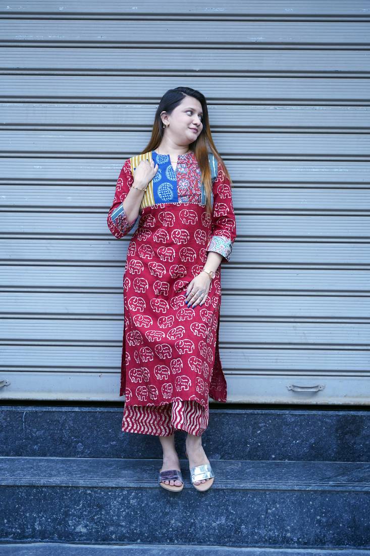 The rich red base adorned with intricate handblock motifs creates a bold yet elegant statement. Paired with coordinated wide-leg plazo pants, this set offers a flattering silhouette while ensuring all-day ease. Crafted in breathable cotton fabric, it is perfect for festive gatherings, office wear, casual outings, or special day occasions.