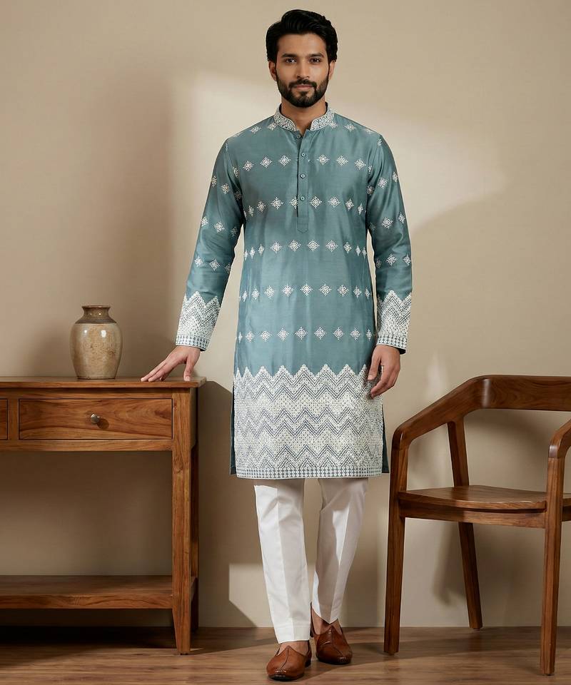 Aqua Blue Designer Festive Wear Satin Kurta Pajama