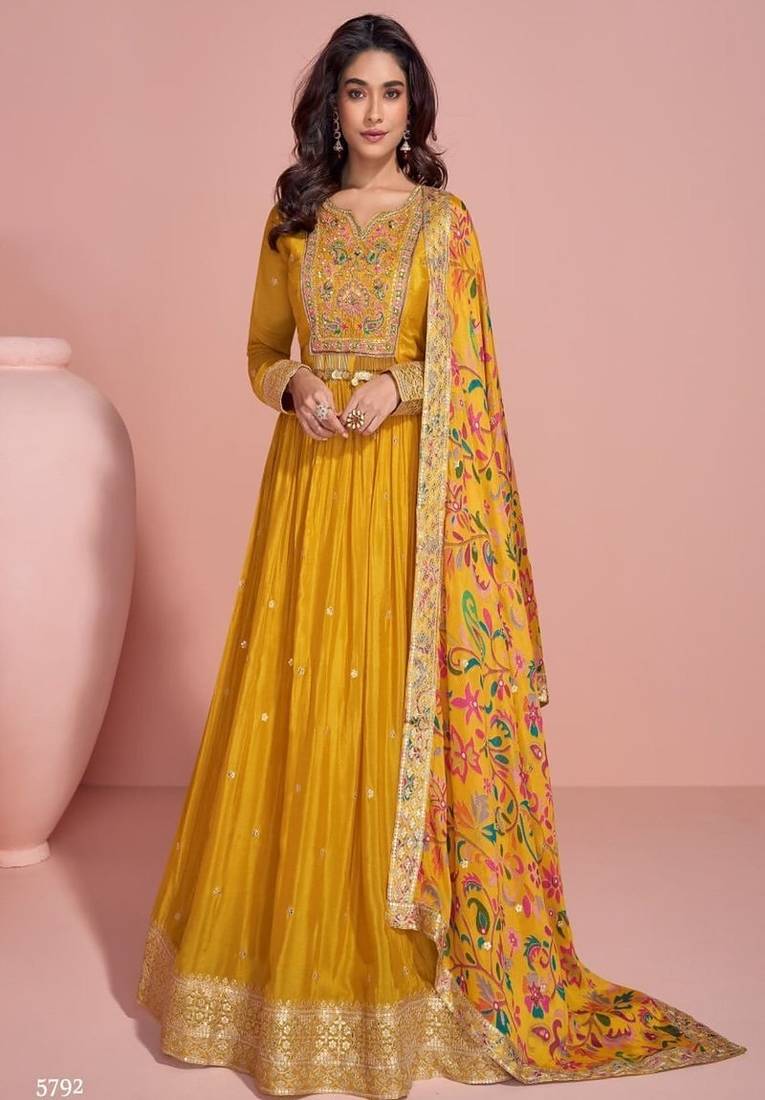 Mustard Chinon Silk Long Gown With Print Embroidery