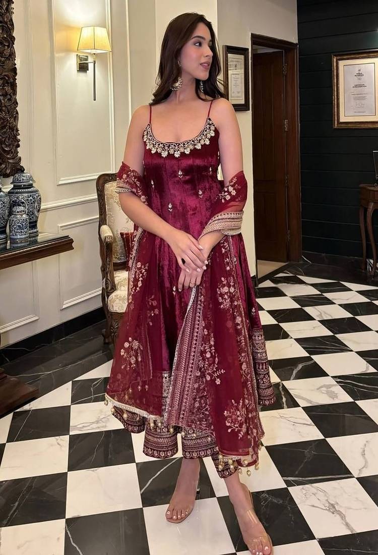 Maroon Anarkali Suit Set Zari Sequins 3 Piece Gown Outfit