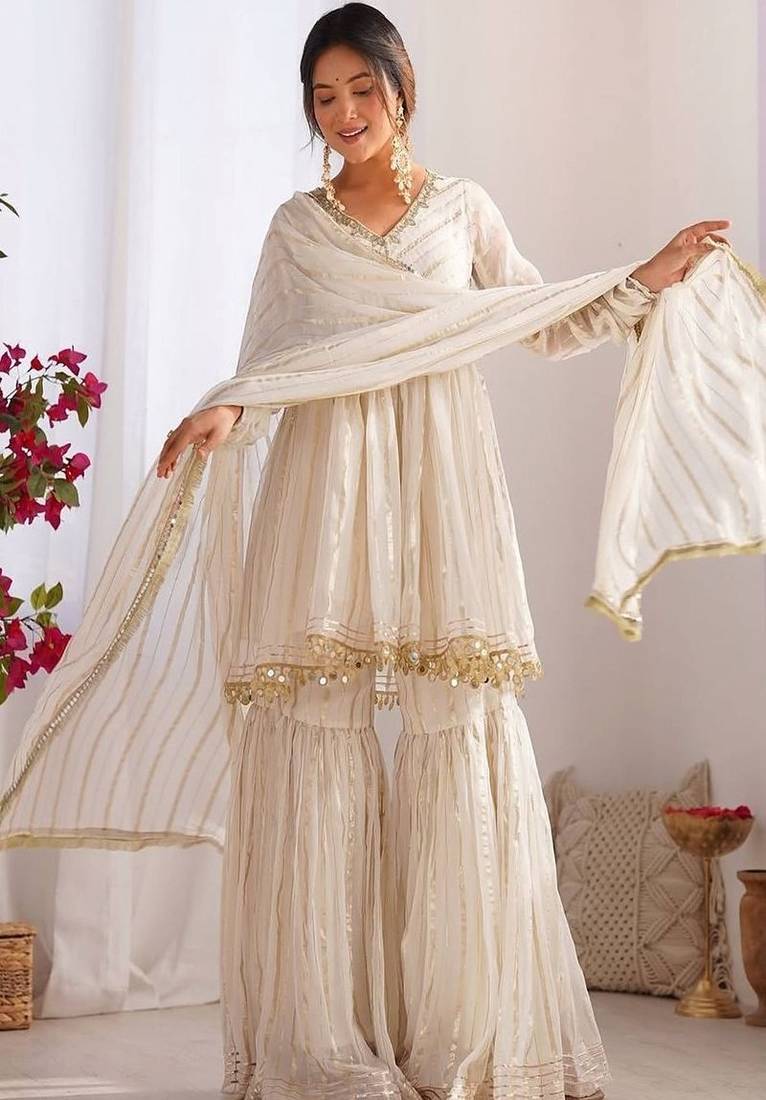 White Mal Chanderi Sharara Set Designer Mirror Work Outfit