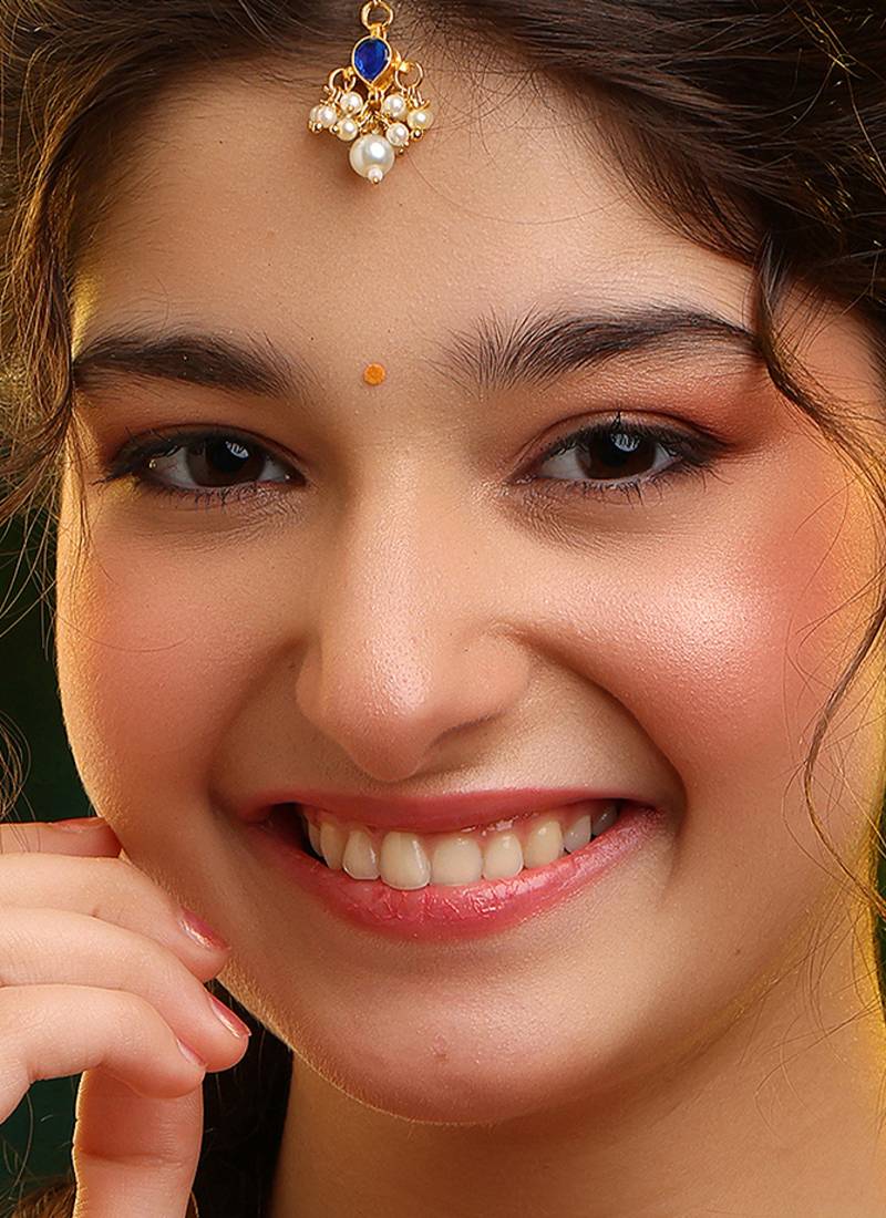 Highlighted With Deep Blue Stones, This Gold Plated Kundan Maang Tikka Adds Royal Charm And Elegance. The Intricate Craftsmanship Ensures A Comfortable Fit And Stunning Visual Appeal. Perfect For Weddings And Festive Celebrations, It Complements Sarees And Lehengas, Enhancing Ethnic Hairstyles With Timeless Beauty.