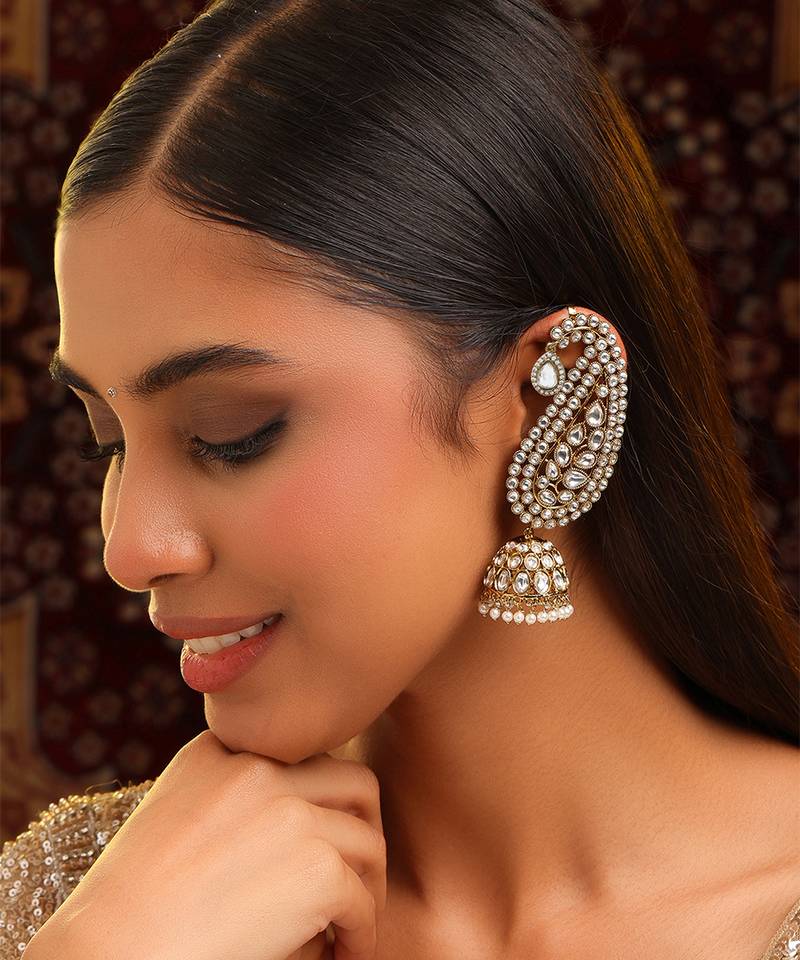 These Gold Plated Kundan Earrings Embody Classic Elegance And Fine Craftsmanship. Featuring Intricate Kundan Work, They Create A Timeless Accessory For Festive And Bridal Styling. Perfect For Weddings And Celebrations, These Earrings Enhance Sarees, Lehengas, And Traditional Outfits With Graceful Appeal.