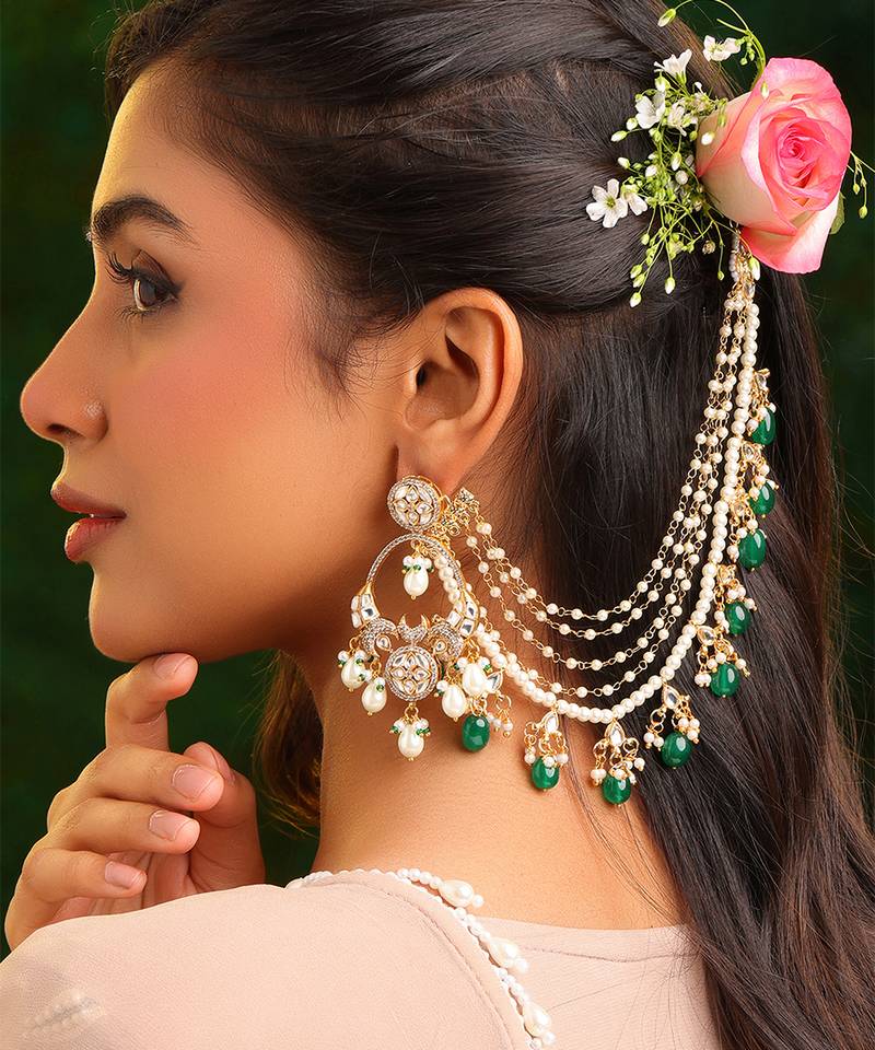 • Product Id : 4697263 • Package Details : 1 Kaan Chain • Type : Earrings • Occasion : Wedding • Look : Traditional • Jewellery Work : Kundan • Color : Green • Plating : Yellow Gold • Base Material : Brass Payments [+]