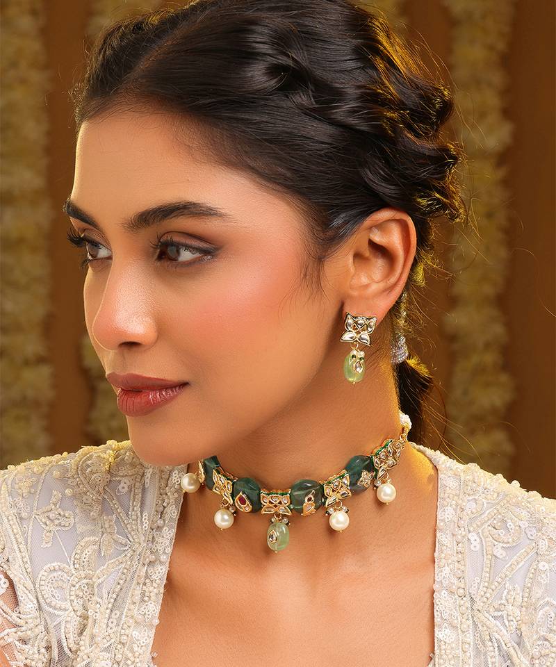 Gold Plated Kundan Green Stones Choker Necklace Set