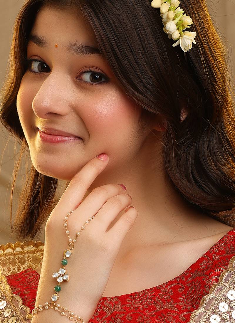 This Gold Plated Kundan Haath Phool Adorned With Green Stones Brings A Fresh And Elegant Festive Appeal. Designed With Detailed Craftsmanship, It Connects Ring And Bracelet Seamlessly. Perfect For Weddings And Cultural Events, It Enhances Ethnic Outfits While Adding Charm To Hand Styling.