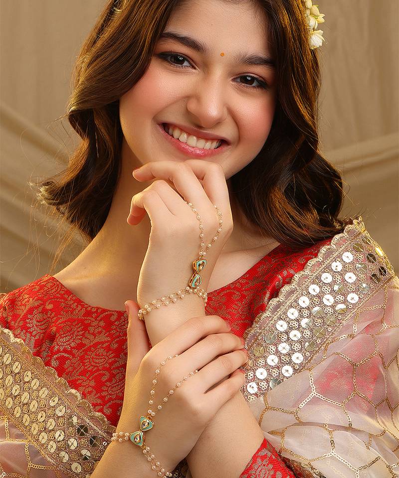 Adorned With Luminous Green Stones, This Gold Plated Kundan Haath Phool Reflects Traditional Beauty And Royal Elegance. The Intricate Design Enhances Hand Movements While Providing A Comfortable Fit. Ideal For Weddings And Cultural Celebrations, It Pairs Beautifully With Ethnic Attire For A Polished Festive Look.