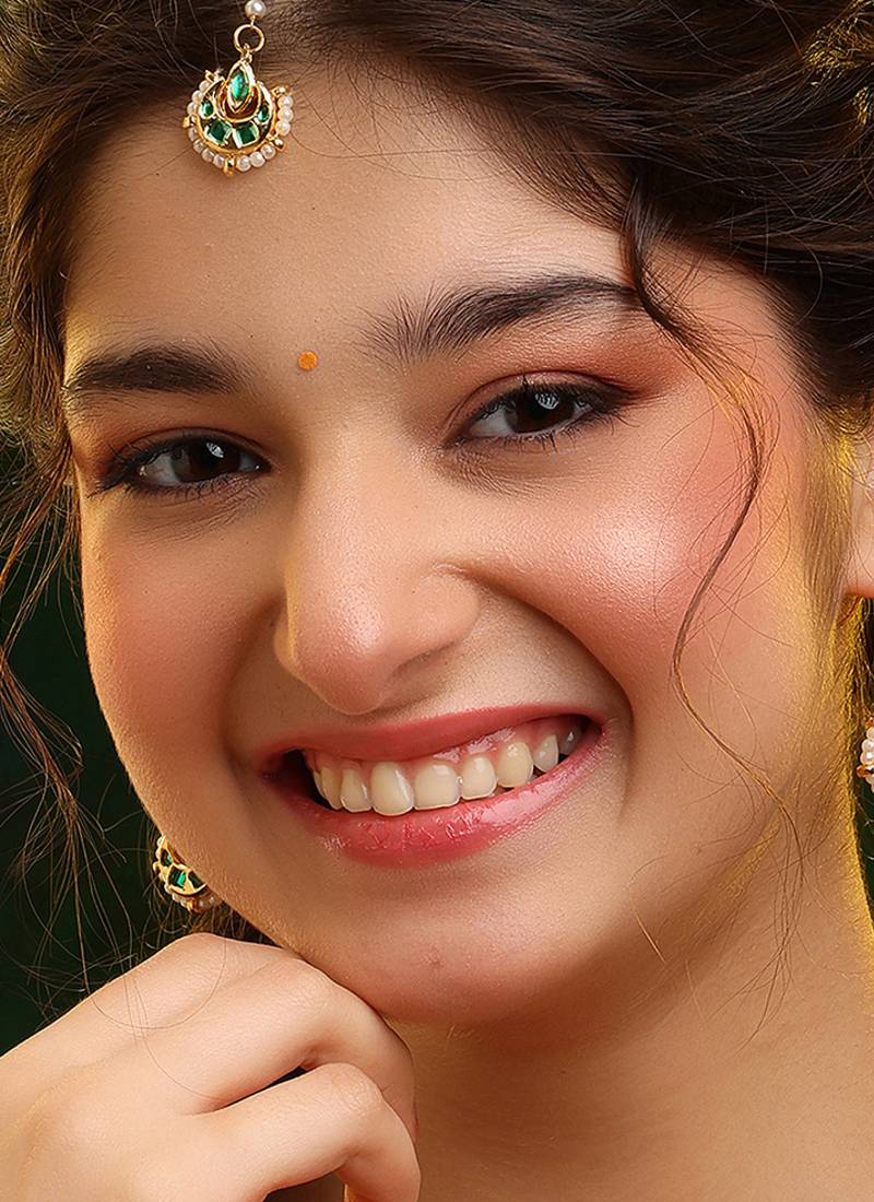 Featuring Radiant Green Stones, This Gold Plated Kundan Maang Tikka Offers A Refreshing And Regal Look. Designed With Fine Craftsmanship, It Beautifully Frames The Face While Enhancing Traditional Outfits. Ideal For Weddings And Festive Events, It Brings A Touch Of Elegance And Vibrant Color.