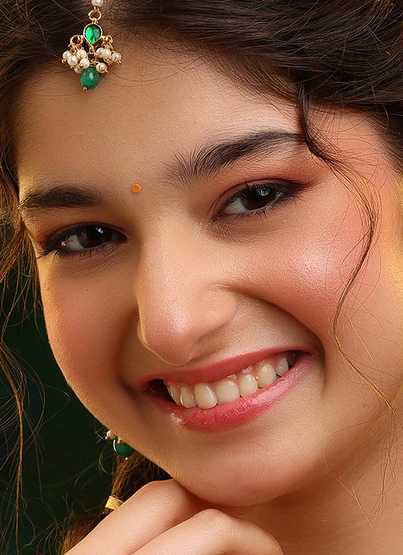 This Beautifully Crafted Gold Plated Kundan Maang Tikka Features Rich Green Stones That Symbolize Elegance And Tradition. Its Detailed Design Highlights Classic Artistry And Refined Finishing. Suitable For Bridal And Festive Wear, It Adds A Graceful Focal Point To Your Look While Enhancing Traditional Outfits.