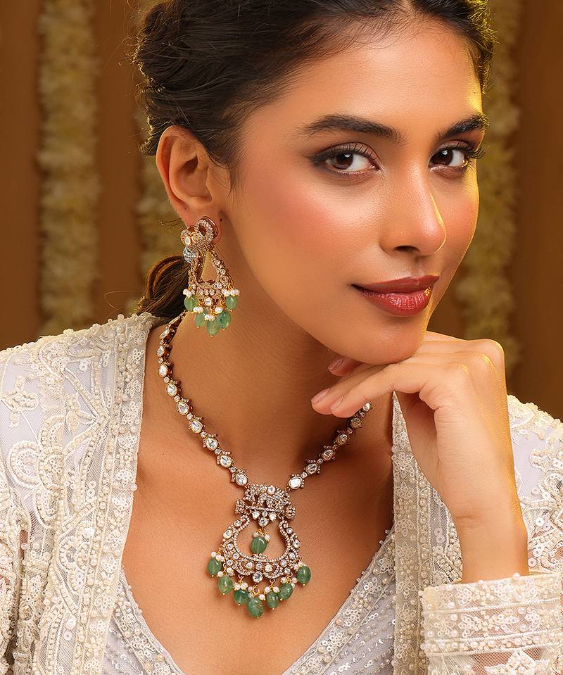 • Product Id : 4697257 • Package Details : 1 Necklace / 1 Pair Of Earring • Type : Necklace Sets • Occasion : Wedding • Look : Traditional • Jewellery Work : Kundan • Color : Green • Plating : Yellow Gold • Base Material : Brass Payments [+]