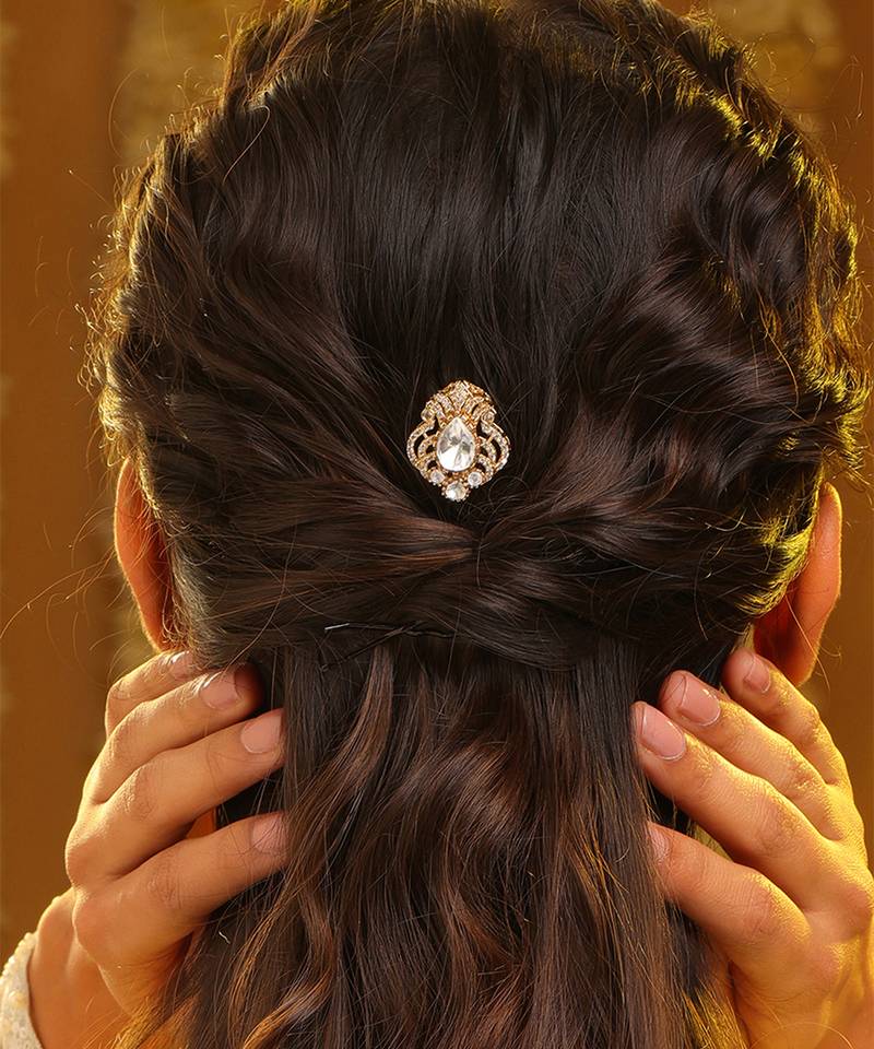 • Product Id : 4697214 • Package Details : 1 Hair Clip • Type : Hair Accessories • Occasion : Wedding • Look : Traditional • Jewellery Work : Kundan • Color : Gold • Plating : Yellow Gold • Base Material : Brass Payments [+]