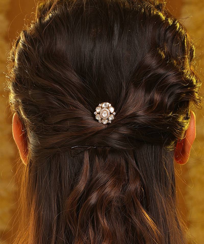 This Gold Plated Kundan Hair Clip Adds Traditional Elegance To Festive And Bridal Hairstyles. Crafted With Classic Kundan Detailing, It Enhances Buns, Braids, And Open Hair With A Refined Touch. Perfect For Weddings And Celebrations, This Accessory Brings Graceful Charm And A Luxurious Finish To Ethnic Looks.