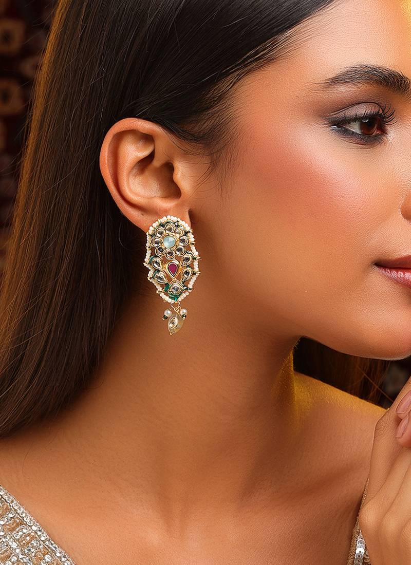 These Gold Plated Kundan Multicolor Stones Earrings Feature Vibrant Hues And Exquisite Craftsmanship. Adorned With Multicolor Stones And Traditional Kundan Work, They Add A Festive Charm To Any Look. Ideal For Weddings And Celebrations, These Earrings Pair Beautifully With Sarees, Lehengas, And Ethnic Wear.