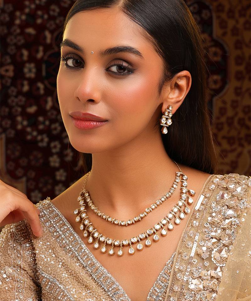 This Gold Plated Kundan Necklace Set Reflects Traditional Beauty And Classic Design. Crafted With Intricate Kundan Work, It Creates A Luxurious Accessory For Special Occasions. Ideal For Weddings And Cultural Celebrations, This Necklace Set Pairs Gracefully With Sarees And Lehengas For A Refined Finish.