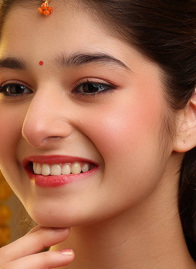 This Gold Plated Kundan Maang Tikka Is Highlighted With Vibrant Orange Stones For A Bright And Festive Look. Crafted With Detailed Artistry, It Adds Warmth And Color To Traditional Attire. Ideal For Pre-Wedding Functions And Celebrations, It Enhances Ethnic Ensembles With Cheerful Elegance.