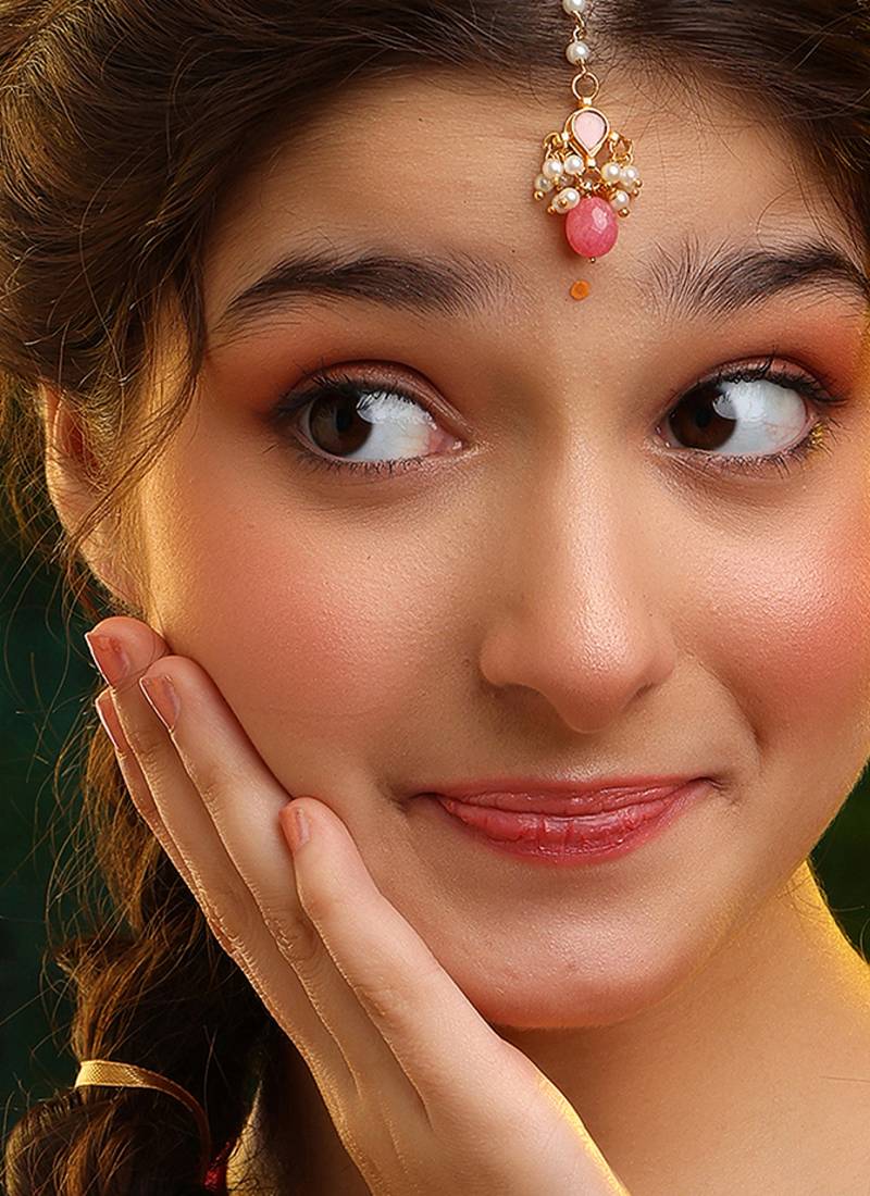 This Gold Plated Kundan Maang Tikka Is Adorned With Soft Pink Stones For A Delicate Yet Festive Look. Crafted With Intricate Detailing, It Enhances Bridal And Traditional Hairstyles Gracefully. Perfect For Weddings And Celebrations, It Adds Charm, Femininity, And Elegance To Ethnic Attire.