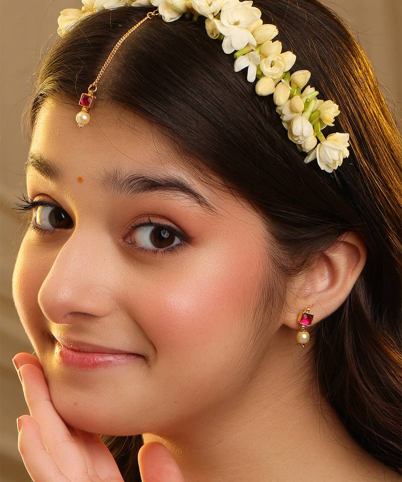 This Gold Plated Kundan Maang Tikka Is Embellished With Radiant Red Stones For A Bold And Traditional Appeal. Designed To Sit Gracefully On The Forehead, It Enhances Bridal And Festive Looks. Perfect For Weddings And Ceremonies, It Adds Elegance And Cultural Richness To Hairstyles.