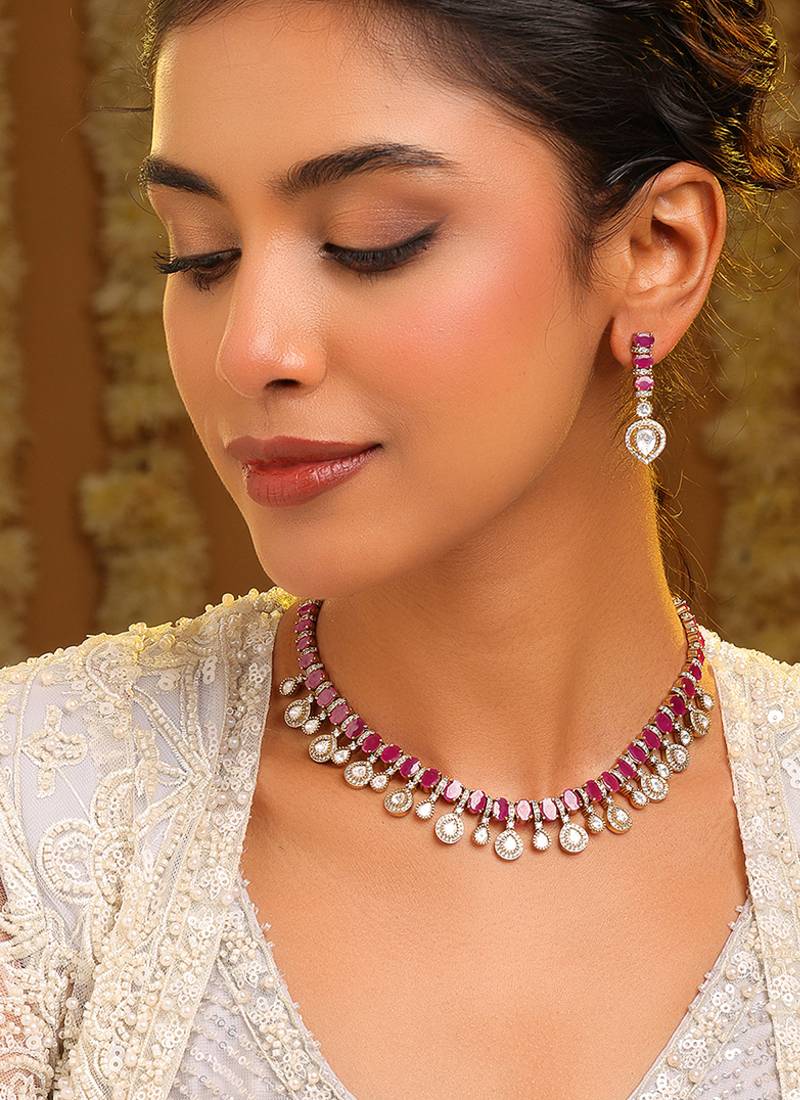 This Gold Plated Kundan Red Stones Necklace Set Highlights Bold Color And Exquisite Detailing. Designed With Traditional Kundan Work And Deep Red Stones, It Adds A Regal Touch To Bridal Looks. Ideal For Weddings And Festive Occasions, This Necklace Set Complements Ethnic Attire With Sophistication.