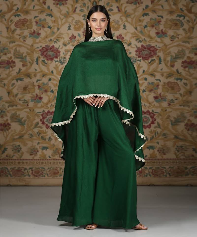 Radiate elegance in this bottle green three-piece ensemble crafted from smooth Vichitra silk. The outfit features a flowing cape-style top with gold lace borders layered over a fitted padded bustier, paired with matching wide-leg palazzo pants. The intricate high-neck detailing acts as a built-in necklace, adding a regal touch to this modern look.