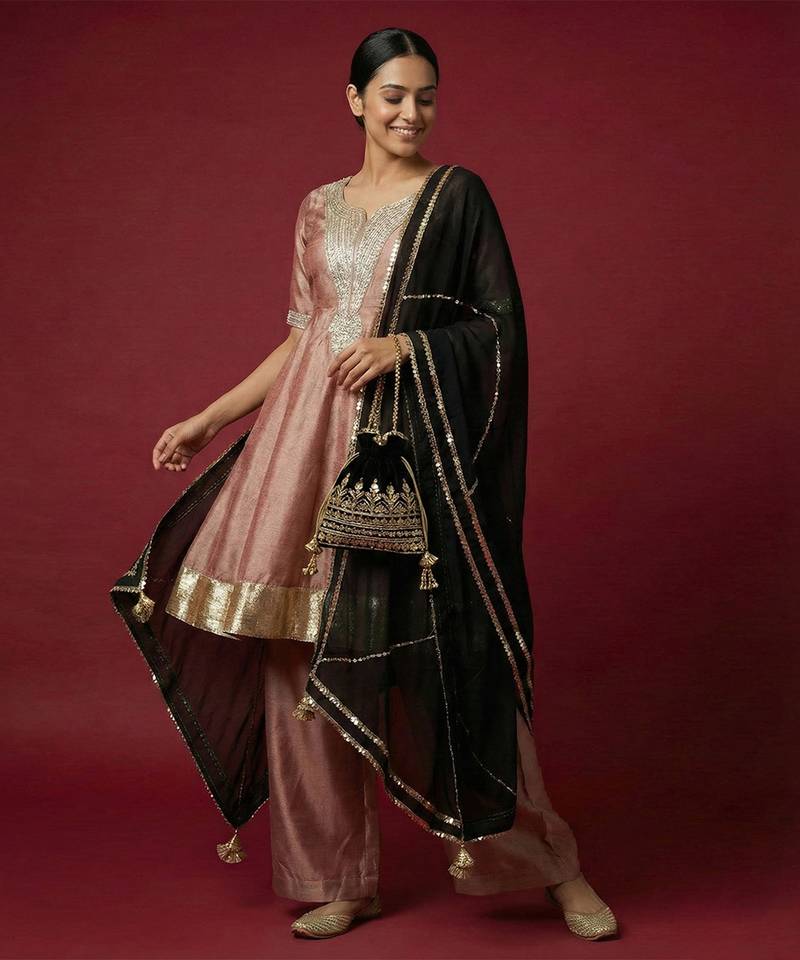 This elegant kurta set is crafted in a rich onion pink hue with a soft, lustrous finish that adds a graceful festive appeal. The kurta is made from vichitra silk and features intricate gold embroidery, highlighted with decorative neck patches and finely detailed sleeve borders. A broad metallic gold hemline border enhances the refined look of the ensemble. It is paired with a sheer organza dupatta in contrasting black, beautifully finished with gold lace edging and subtle sequin detailing, adding fluidity and elegance to the drape. The matching bottom completes the set, offering a balanced and coordinated silhouette.