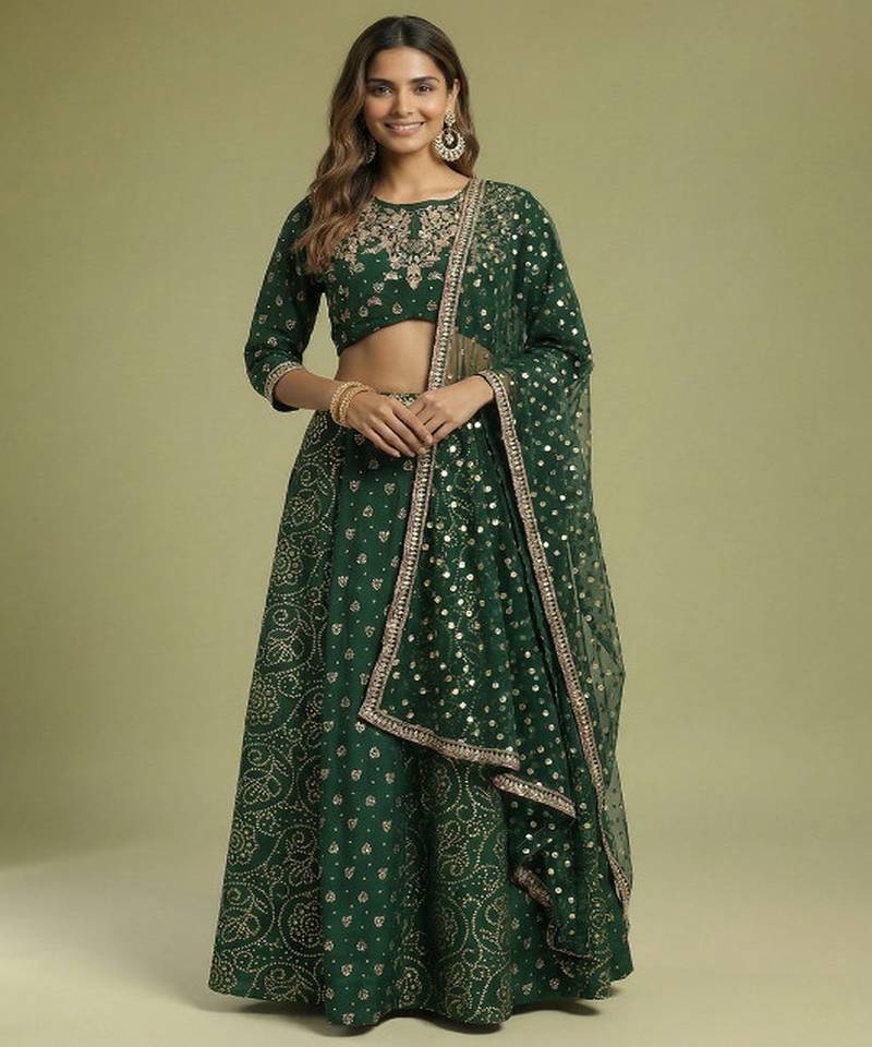 • Product Id : 4756243 • Package Details : 1 Lehenga / 1 Choli / 1 Dupatta • Type : Readymade Lehenga Cholis • Type : Sequins Work • Look : Traditional • Pallu Style : Fancy Pallu • Choli Sleeve : Quarter Sleeve Choli • Choli Neck Style : Round Neck Choli • Lining Fabric : Chiffon • Work : Sequins • Stitching : Stitched General - Color and Texture may have slight variation. This happens because of photography.