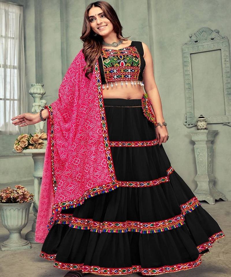 • Style : Circular Lehenga • Fabric : Georgette • Color : Black • Work : Embroidered Dupatta Details